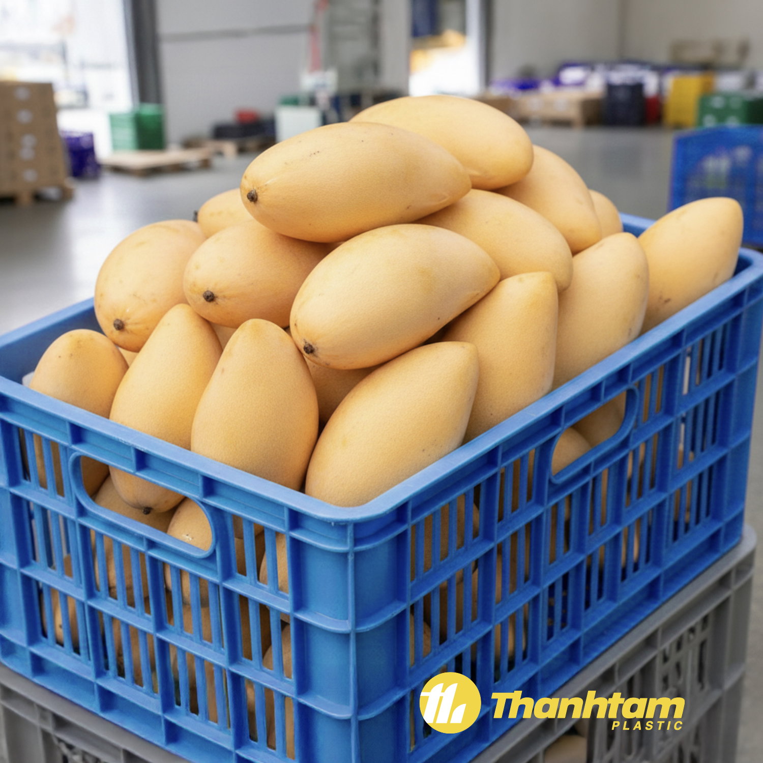Rổ có thiết kế thoáng khí 4 mặt, hạn chế dập nát và giữ xoài tươi lâu, phù hợp cho nhà vườn, thương lái và doanh nghiệp xuất khẩu trái cây.